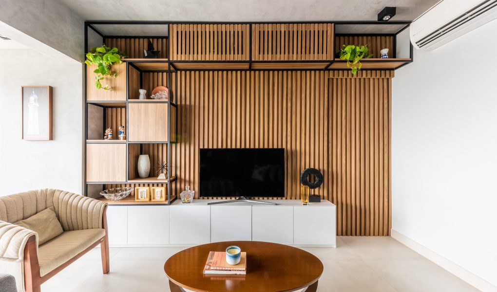 O grande painel ripado se mescla com serralheria, criando um visual descontraído e prático. Na execução, o arquiteto Bruno Moraes previu nichos aéreos e laterais com a estrutura preta | Projeto BMA Studio | Foto: Guilherme Pucci
