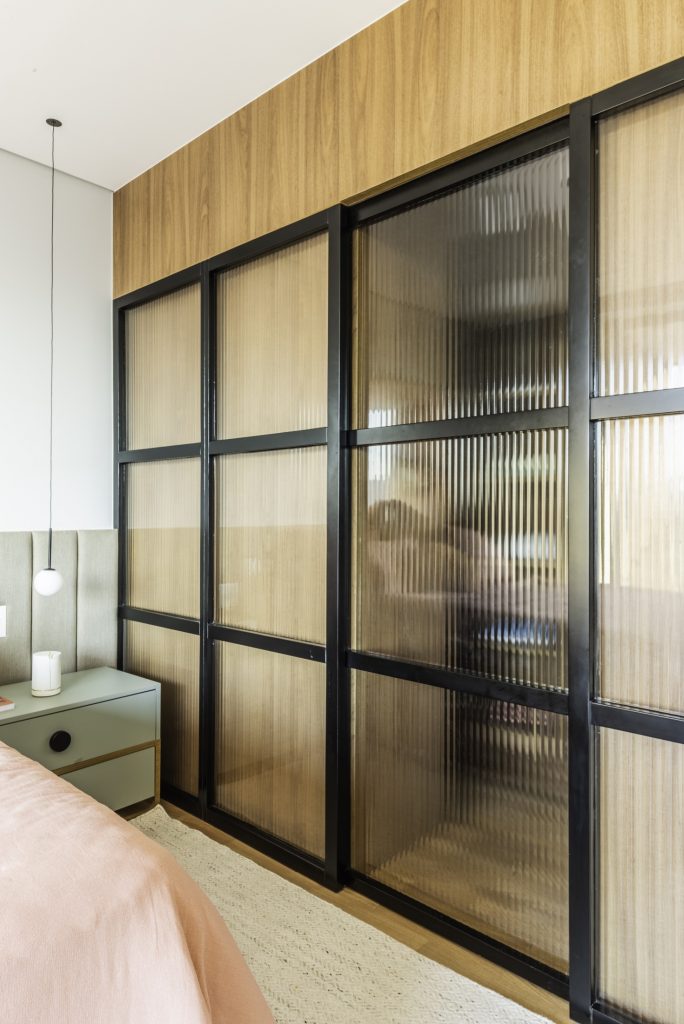 No dormitório realizado pelo arquiteto Bruno Moraes, a porta de serralheria e vidro canelado separa o quarto do closet | Projeto BMA Studio | Foto: Guilherme Pucci