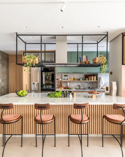 Nesta cozinha aberta idealizada pelo arquiteto Bruno Moraes, a serralheria que centralizou a coifa recebeu uma atribuição decorativa com livros de receitas e plantas | Projeto BMA Studio | Foto: Guilherme Pucci