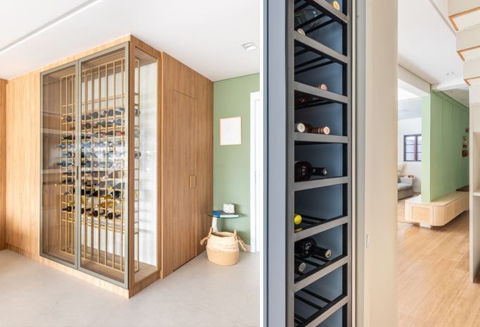 No projeto à esquerda, o acabamento gold do metal realça os detalhes e o jogo entre nichos cheios e vazios forma um desenho único. À direita, o arquiteto Bruno Moraes otimizou um pequeno espaço sem uso para conceber uma adega que guardam os rótulos colecionados pelos moradores | Projeto BMA Studio | Foto: Guilherme Pucci