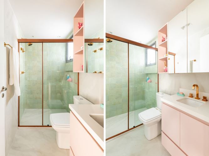 Para conciliar com o romantismo do rosa que o arquiteto Bruno Moraes elegeu para a marcenaria, o box do banheiro ganhou o tom rose, além dos metais (misturadores, chuveiros, registros e suporte para toalha) | Projeto BMA Studio | Foto: Guilherme Pucci
